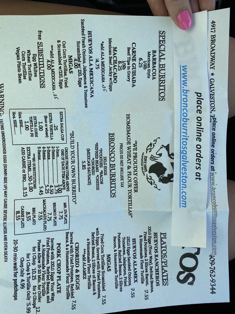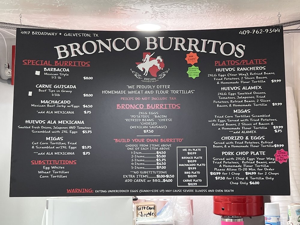 Bronco Burritos, located in Galveston, TX, offers a delectable menu of Latin American and Mexican dishes. Customers rave about the Bronco Burrito, a hearty combination of eggs, diced potatoes, chorizo, refried beans, cheddar cheese, and bacon, all wrapped in a homemade flour tortilla. The menu also features customizable burritos with various fillings, such as Barbacoa and Carne Guisada. Customers appreciate the fresh ingredients and generous portions. The restaurant has a casual atmosphere with options for outdoor seating and drive-thru service. With excellent service and efficient ordering, Bronco Burritos is a must-visit for breakfast or brunch. The green salsa adds a flavorful kick to the dishes, making it a favorite among locals and visitors alike.